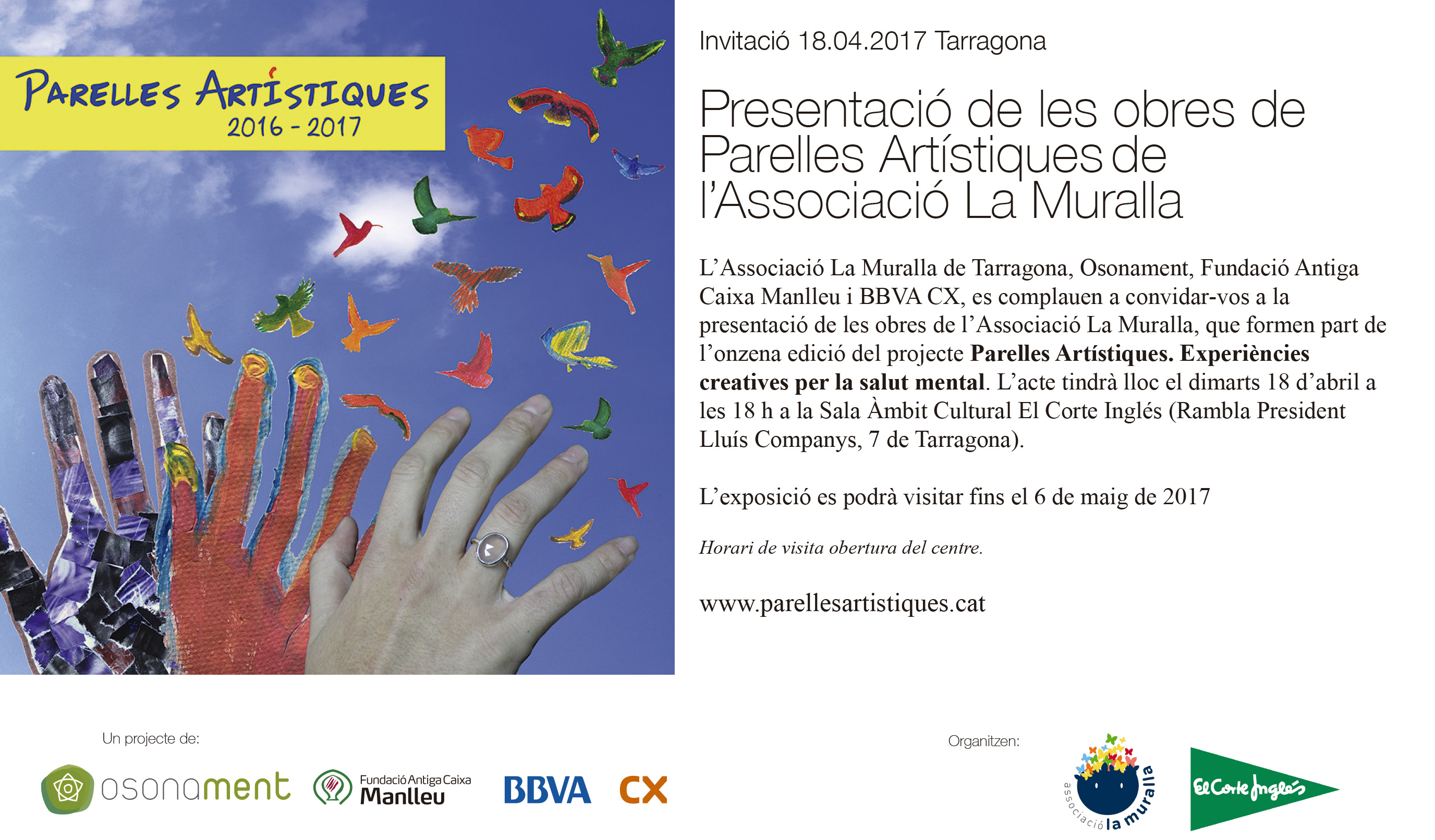 Avui dimarts, a les 18h, presentarem les obre de Parelles Artístiques que han fet a l’Associació Ment i Salut La Muralla a la Sala Àmbit Cultural El Corte Inglés. L’exposició es podrà visitar fins el 6 de maig i inclou 15 obres realitzades amb diferents tècniques com dibuix, pintura a l’oli, acrílica, gravat, ceràmica, fotografia…L’acte comptarà amb l’explicació de l’experiència per part d’una de les 15 parelles participants. Us hi esperem!