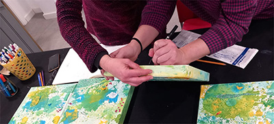 I observem com a la nostra obra li hem sumat una vessant de conscienciació: un “preciós” mar de plàstic. Ens adonem també que la pintura acrílica és plàstic i afegim a la composició bosses i trossets de plàstic de colors per fer-ho encara més evident.